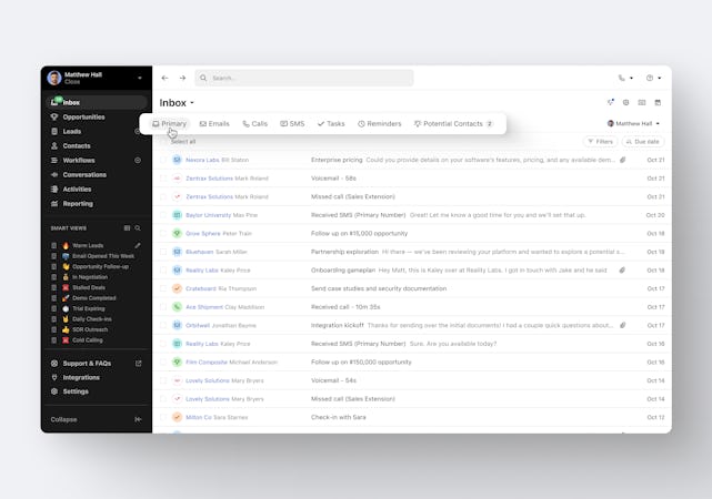 Close is a conversation-first CRM (customer relationship management) solution built for founders and small, scaling sales teams to manage every conversation in one place — so they can move faster and close more deals. With built-in calling, email, SMS, automation, and AI, Close eliminates tool sprawl and manual logging so teams can focus on selling, not admin. Close is used by small to mid-sized sales teams (typically 1 to 100 reps) in SaaS, fintech, real estate, insurance, recruiting, staffing, and professional services — particularly by founders and sales managers running relationship-driven sales at companies that prioritize speed and follow-up discipline. Plans start at $9/user/month with built-in calling, email, and SMS included. Plans scale as your team grows: Solo ($9), Essentials ($35), Growth ($99), and Scale ($139). Custom pricing available for teams of 10+. No contracts required. 14-day free trial — no credit card, no obligation.