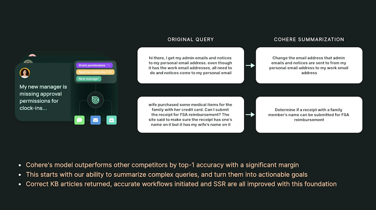 Delight customers faster with AI-powered support. Cohere aims to automate every support interaction across an organization by using AI to understand, curate, and surface knowledge for both customers and internal teams.