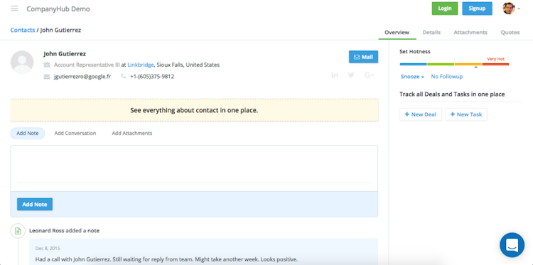 In order to manage leads effectively, CompanyHub equips users with intelligent follow-up suggestions, a 360° contact view and email syncing and tracking functionality. By syncing and tracking email activity, CompanyHub enables users to capture and create leads automatically as well as track email opens and link clicks accurately. Since CompanyHub tracks conversations with leads, users can receive follow-up reminders after a long period of inactivity or lack of interaction with sales prospects.