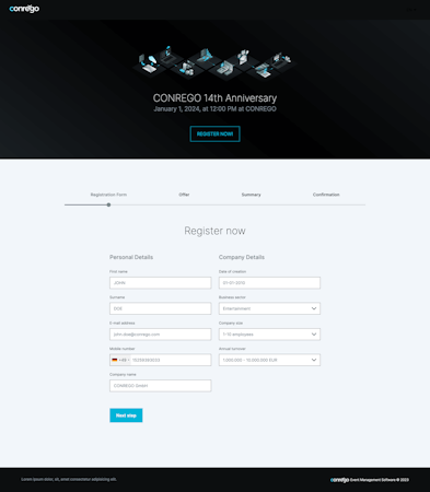 CONREGO is an event registration and attendee management solution designed for event organizers with tools for website creation, payment processing, and more. The SaaS platform provides modules for reporting, mailing, custom website building, PDF creation, registration management, electronic payments, survey and feedback collection, attendee tracking, and more in order to help with the end-to-end planning and execution of events.