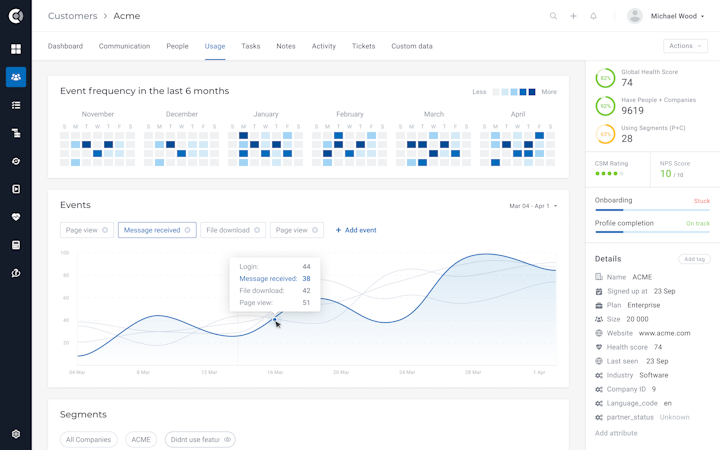 The application enables managers to gain insight into customer product adoption behavior by tracking product usage in real-time. Custify helps businesses monitor utilization of licenses by prospective buyers, helping to identify renewal and upsell opportunities for additional services. Marketing teams can use Custify for customer outreach with tools for evaluating health scores, and the ability to analyze client satisfaction through a rating system.