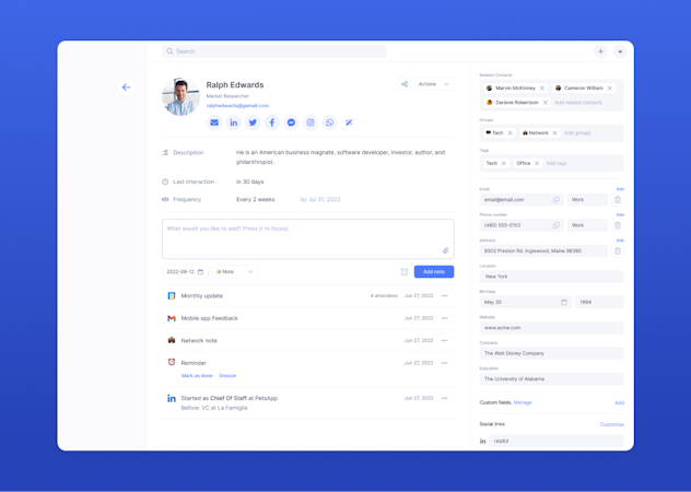 Dex seamlessly integrates with existing tools and helps teams get out more of them. For example, a LinkedIn network is constantly synchronized, so managers can see when friends change job titles. Moreover, Dex allows organizations to keep track of important details. A mobile app lets teams neatly manage contacts on the go. And a designated browser extension enables you to add contact details directly from any social media website you use. Dex is rich with features that help you unlock the network's potential.