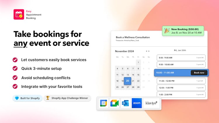 The app offers a wide range of features to streamline the booking process. Merchants can set up flexible scheduling with weekly, one-day, or customized calendars, and embed an event calendar to showcase real-time availability. Automatic notifications and follow-up emails keep customers and staff informed, while the secure, reliable platform ensures accurate bookings. Integrations with Google Calendar, Zoom, Zapier, Microsoft Outlook, and Klaviyo further enhance the functionality, allowing businesses to seamlessly connect their booking system with the tools they use every day.