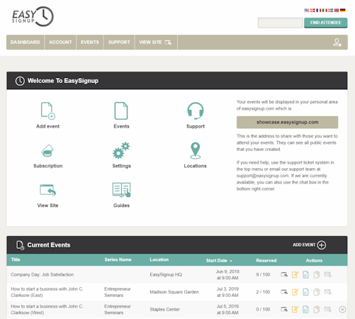EasySignup is an online signup system that supports organizers of any event with a secured solution for capturing attendee registrations and managing the event itself. Regardless of the type of event, whether it's for customers, a training course, business seminars, trade conferences or simply a staff party, EasySignup offers a flexible pricing plan suited to businesses and individuals alike. Users are then able to create new scheduled events with their own pages that can be started from template or replicated from a prior event, either way fully customizable in terms of layout and content. Users can set an event title, insert and format description text, and enter time / location details before adding images and logos to create a basic presence. Extras then include location maps via Google Maps, attendee lists, itinerary schedules, multiple ticketing types with tiered pricing levels and signup forms with custom fields and smart data for capturing all required registration information. Event calendars can also then be integrated into an existing external website at extra cost.
