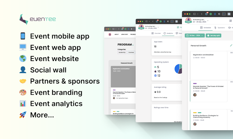 Eventee is the most easy-to-use tool for organizing in-person and hybrid events. The intuitive and beautiful interface of both mobile and web app enables you to manage your event, increase attendee engagement, and improve the overall event experience effortlessly. Take advantage of the features Eventee offers: event agenda, live streaming, workshop bookings, newsfeed, moderated live questions & polls, networking, partners showcase, custom integrations, custom branding, analytics, and much more!