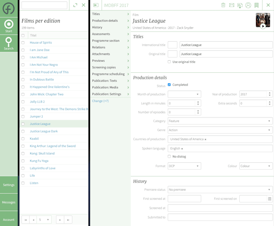 Organizers can add catalogue texts in several languages directly to programmes, films, events and screenings, and publish content in real time via the API including high-resolution stills, website and online video URLs, documents, and more. Users can create guest lists to invite individuals such as sponsors, board members, and filmmakers, as well as schedule guest one-on-one meetings and publish appointments online. Fiona has the ability to handle both digital and non-digital films, and helps users with process of entering DCP screening copies, as well as film reel distribution to projection rooms.