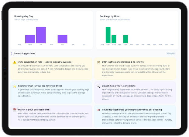 Payment and client management features support collection of deposits or full prepayments according to configurable cancellation policies that the system enforces automatically. There is no fee on deposit transactions and a modest processing fee applies to full payment and voucher sales. Detailed client profiles capture appointment history, service records, spending data and custom notes, and these profiles may be exported at any time. Additional tools include image attachments for client inspiration, custom consultation forms for pre-service checks, automated delivery of aftercare instructions, promotional discount configuration and support for recurring appointment series.