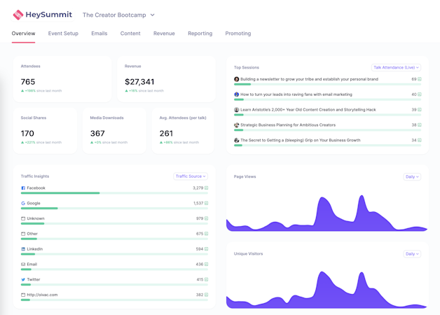 HeySummit includes a landing page builder and an integrated ticketing system. Its reporting and analytics tools help event managers gain insights into the audience's preferences and behavior.