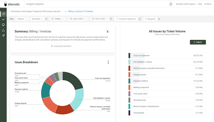 Idiomatic's platform takes all forms of unstructured customer feedback (Zendesk, Salesforce, Delighted, Qualtrics, Social Media, etc.) and manually creates labels for our AI to automatically categorize and quantify what customers are saying.