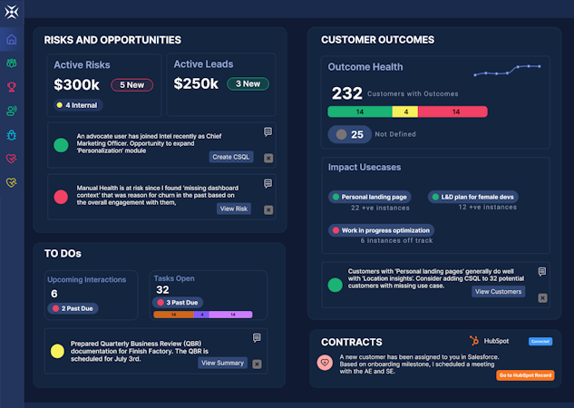 Key capabilities include risk management through predictive models trained on industry data; automated analysis of emails, meetings, and other unstructured data to uncover signals; and identification of upsell and cross-sell opportunities based on usage trends. Seamless integrations with Salesforce, HubSpot, Asana, and other platforms enhance existing workflows instead of introducing new tools.