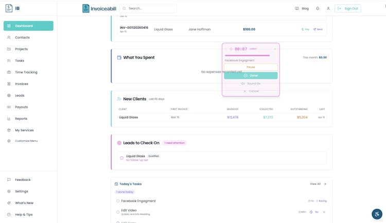 Invoiceabill is a comprehensive business management platform tailored for freelance professionals and independent contractors who require an integrated solution for invoicing, time tracking, client relationship management and payment processing. The application functions as a centralized operating system that consolidates administrative workflows traditionally spread across disparate tools into a unified workspace. The solution accommodates a range of industries including videography, photography, construction, cinematography and design by providing support for the entire client engagement lifecycle from lead generation through payment reconciliation.