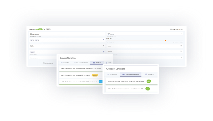 The platform supports feedback capture mechanisms and integrates sociodemographic information, corporate data, context parameters, segmentation criteria, saturation controls, and time limitations into its decision logic. Institutions can configure complex conditional logic to address potentially negative customer situations and provide context-sensitive recommendations during active engagement. The combination of real-time events and comprehensive data utilization drives more relevant customer interactions.