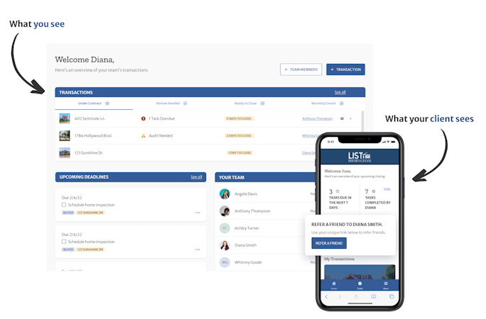 Discover the power of ListedKit, a comprehensive and user-friendly platform designed to revolutionize how you manage your team's transactions and keep your clients informed every step of the way. With an intuitive and collaborative interface, ListedKit empowers you to effortlessly oversee your team's activities and ensure seamless communication with clients.