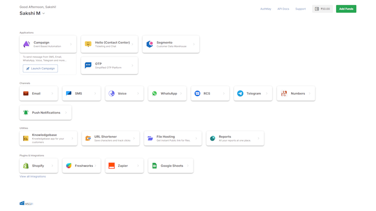 MSG91 is a cloud communications platform that offers a diverse range of services to facilitate streamlined communication. With MSG91, users gain access to a suite of channel APIs, including SMS, email, WhatsApp, voice, authentication, and more, allowing for multi-channel communication. The platform also provides serverless tools and fully programmable solutions such as Hello, Campaign, Segmento, SendOTP, ShortURL, and KnowledgeBase, offering ready-to-use capabilities.