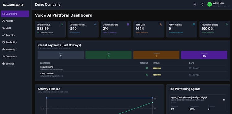 Unlike basic IVR systems or scripted chatbots, NeverClosed.AI agents engage in natural, dynamic conversations powered by advanced large language models and ElevenLabs voice synthesis. Callers interact with agents that understand context, handle complex booking scenarios, and adapt to conversational nuances in real time.