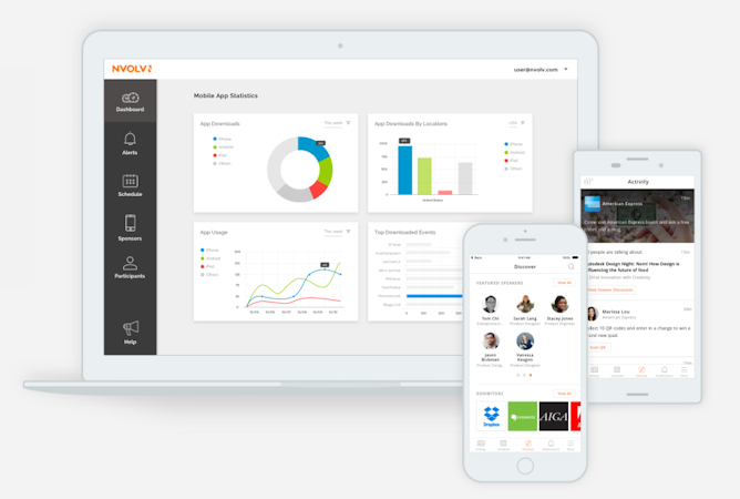 NVOLV is a mobile event app solution, providing native iOS and Android apps for conferences, trade shows, corporate events, and more. Both standard and custom branded apps are available, with a range of standard features and optional add-ons, including event check-in/check-out and gamification.