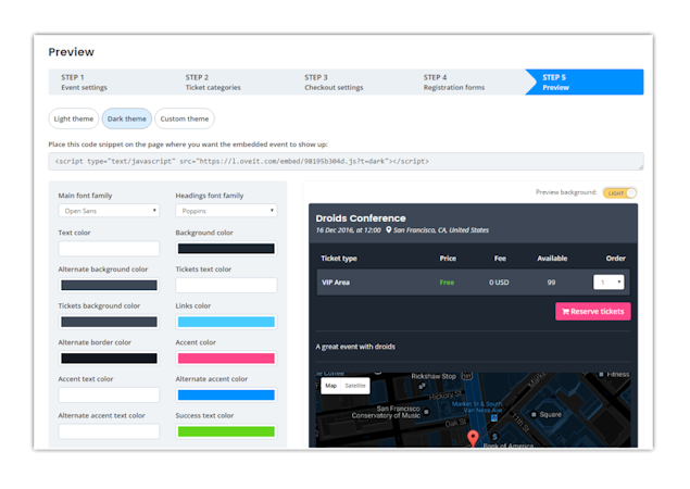 Oveit supports multiple currencies, as well as languages and offers an automated invoicing system to manage global events. The system can be integrated into websites via an embed code and supports various third-party applications such as PayPal and Stripe.