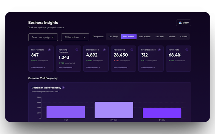 Customer segmentation tools enable filtering by activity level, card type or custom criteria for targeted messaging. A visual heatmap displays customer visit patterns by day and time to inform staffing and promotional scheduling decisions. The software identifies customers at risk by monitoring visit frequency and flagging those who have not returned within defined timeframes. Multiple location support allows management of several physical locations from a single dashboard with options for shared or location specific programs. Staff members validate customer rewards with a scanner application on standard mobile devices. A business page consolidates menus, booking links, social media profiles and loyalty access under one link.