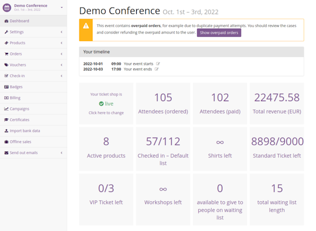 The high felxibility of pretix makes it ideal for every kind of event and ticket use. Pretix also offers automatic badge printing, certificate of attendance, vouchers, add-on products and even more.