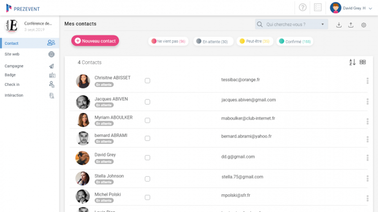 - Prezevent allows organizers to import excel files, segment contacts by category and send personalized invitations, reminders, and notification via email.