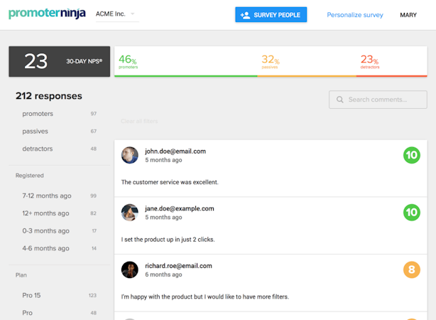 Businesses can import their customer contact list in CSV format and segment customers into groups based on defined criteria such as age range, type of customer, length of time as a customer, and more. Promoter Ninja automatically calculates a business's Net Promoter Score as survey results come in, with graphical analytics and statistics in real time. Results can be filtered to gain better insight into which user segments or demographics are most loyal.