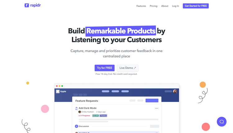 Rapidr is a cloud-based customer experience platform, which helps businesses in technology, consulting, and other industries collect and manage user feedback. The solution offers various features such as a feedback portal, collaboration tools, custom branding, access control, voting, private boards, text editor, email notifications, and more. Rapidr also facilitates third-party integration with various applications such as Slack and Intercom.