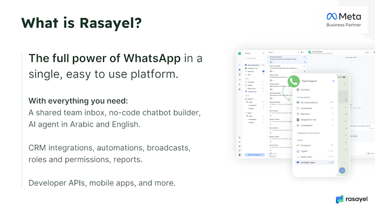 Rasayel is a customer communications platform built to help you sell better over WhatsApp.Rasayel helps you grow your business with a shared team inbox for your entire team, a no-code WhatsApp chatbot builder, automations, sales workflow management, WhatsApp broadcasts, integrations with CRMs, Zapier, developer friendly APIs and webhooks, mobile apps for iOS and Android, and more.
