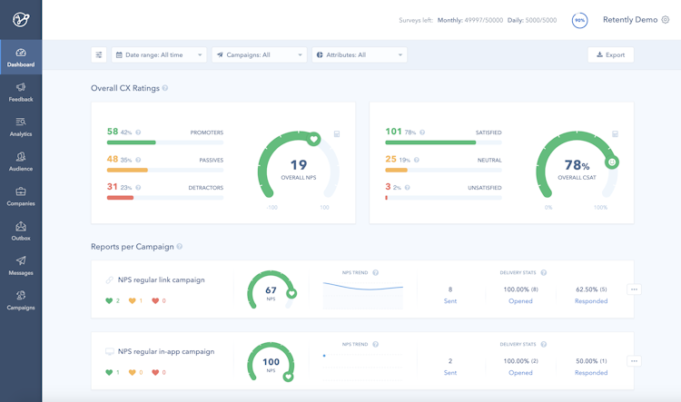 The fully customizable Retently Net Promoter Survey platform allows businesses to collect customer feedback, create workflows, and boost customer satisfaction by sending customers a single question satisfaction survey. Customers can then give the business a score based on how likely they are to recommend the company to a friend, and provide additional feedback, and a total Net Promoter Score will be calculated based on the survey responses. Surveys can be distributed via email, or triggered within the business app or website, and multiple channels can be utilized for increased response rates. Retently also facilitates the triggering of surveys based on specific, predefined actions such as a visitor leaving the web page or the finalization of a sale.