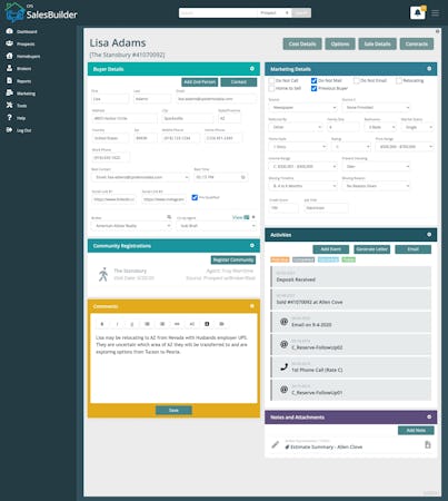 SalesBuilder CRM captures and nurtures prospects, manages recorded sales, tracks option selections, and generates contracts. It also offers marketing features for connecting with prospects & recording activity: email follow-up, phone logger, & letters for mailing.