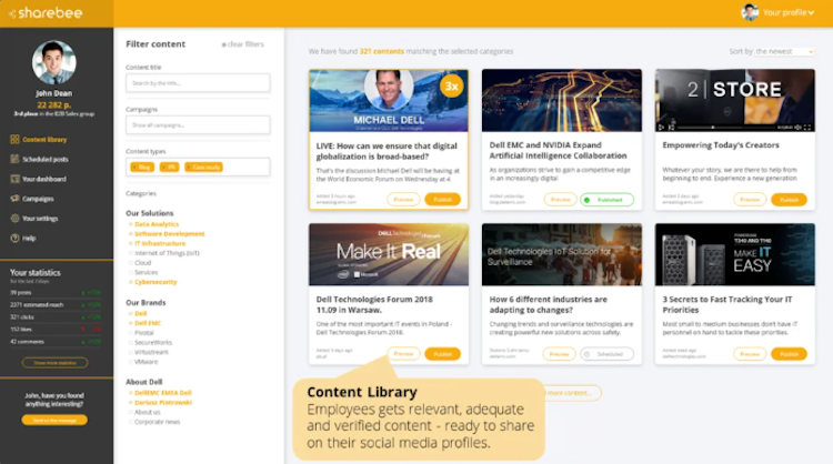 Sharebee also provides tools to create content for employees' private profiles. With a built-in content library, employees can share company-approved content on their social media profiles.