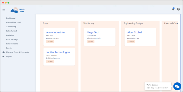 Solar CRM is a cloud-based solution designed for solar installers to manage lead generation and sales tracking operations. The platform simplifies lead capturing, tracking, proposal creation, follow-ups, and other sales activities.
