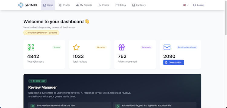 SpiniX is a gamified customer retention and marketing automation platform designed for restaurant and food service establishments. The software addresses the hospitality industry challenge of low return rates by implementing an interactive QR code prize wheel that incentivizes guest engagement, review generation and email list building. SpiniX primarily serves independent restaurants, cafés, pizzerias and similar businesses across international markets that compete for customer loyalty.
