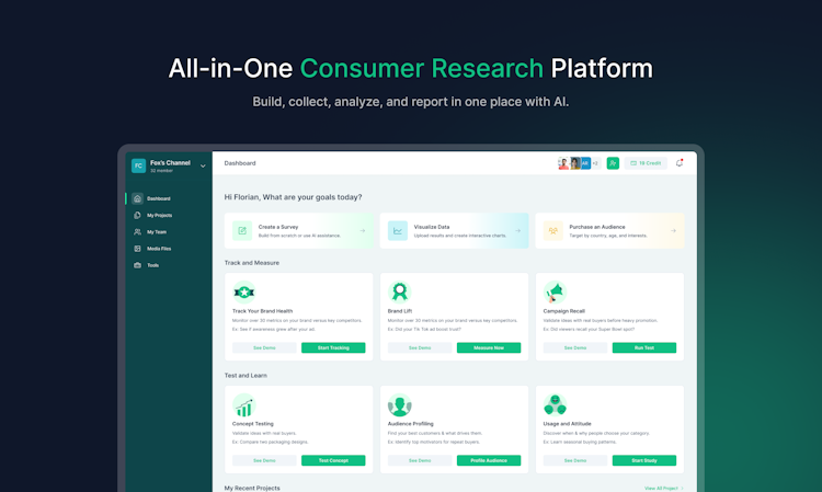 The platform features a modular structure that addresses each phase of the research workflow. Users can design surveys using AI-powered creation tools that include logic, branching, and translation capabilities, all within an intuitive builder that supports custom branding. The recruitment module offers access to respondents in over one hundred fifty countries through multi-sourcing sampling methods, with instant pricing and incidence rate estimates. Users can target participants based on demographics, interests, or recruit their own audience via shareable links. The analysis functionality transforms collected data into interactive visualizations automatically, allowing for sophisticated segmentation and filtering by demographics or responses. The platform supports data import from external sources and provides tools for saving audience clusters for deeper analysis.