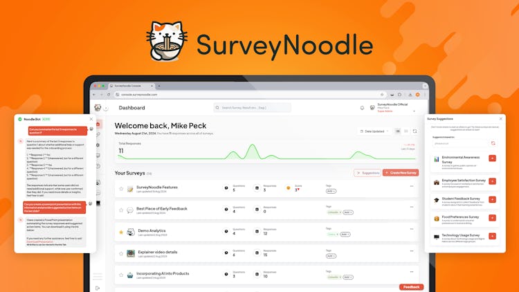 SurveyNoodle is an intuitive platform that simplifies the process of creating, distributing, and analyzing surveys. SurveyNoodle offers a comprehensive suite of features to help organizations unlock valuable insights from customer, employee, and product feedback.
