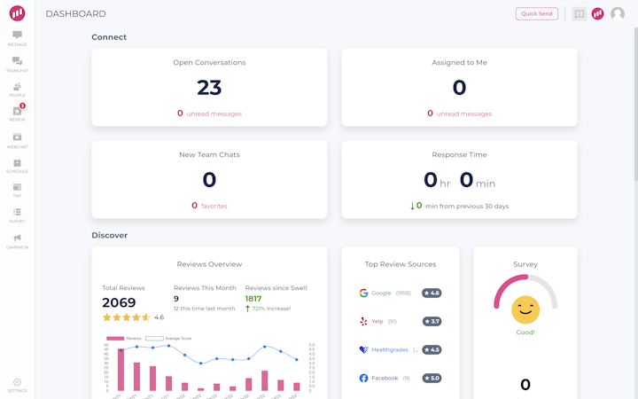Swell CX is a cloud-based platform designed to help small to large businesses collect and manage customer experience feedback through net promoter scores, online reviews, and customer satisfaction (CSAT) surveys. The unified platform comes with a one-click feedback system which allows users to generate positive reviews from customers in real time. Key features of Swell CX include process automation, review management, social media metrics, gamification, sentiment analysis, surveys, trend analysis, and multi-channel feedback collection. The platform comes with a centralized dashboard, which allows users to manage the entire lifecycle of online reviews, from tracking and collection through to final reporting. Enterprises can use text and email support functionalities to directly engage and communicate with customers regarding feedback. Swell CX supports an application programming interface, as well as built-in integration features to connect the platform with third-party CRM, POS, patient management systems, and more. The platform's customization module lets users personalize all aspects and processes of feedback to encourage better response rates.