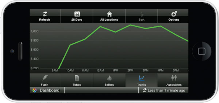 The user can view reports such as sales by location, by volume, and employee performance in the ‘Dashboard’. These reports can also be extracted from the iPad and do not require a PC to extract reports.