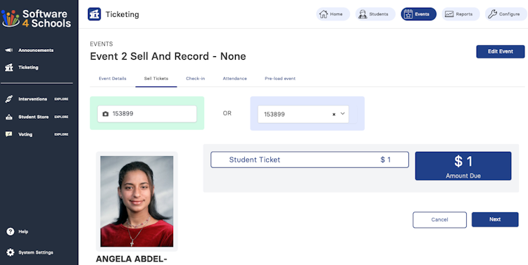 Ticketing 4 Schools is a school ticketing system that is designed specifically for education. Scan student ID cards to sell virtual tickets and all students need to come in the door which is scanned in when they enter. You can use barcode scanners, thermal printers, electronic cash drawers our our mobile app where you can scan student ID cards.