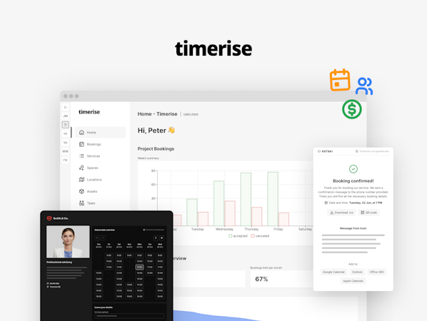 Timerise is a headless online booking system with customization including pages for clients' communication, booking policy, or brand design. It offers a built-in SMS and email functionality. It includes webhooks to help connect applications to Timerise API according to requirements.