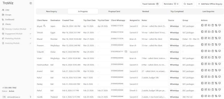 Trawiz is an artificial intelligence-powered customer relationship management and engagement platform for the travel and hospitality industry. The software centralizes client engagement and booking workflows across agencies, hotels, resorts, corporate travel management companies, destination management companies, tour operators and transport providers. It delivers a unified system to automate communication and operational tasks through a WhatsApp-first interface. The platform supports the entire customer journey from initial inquiry to post-trip feedback.