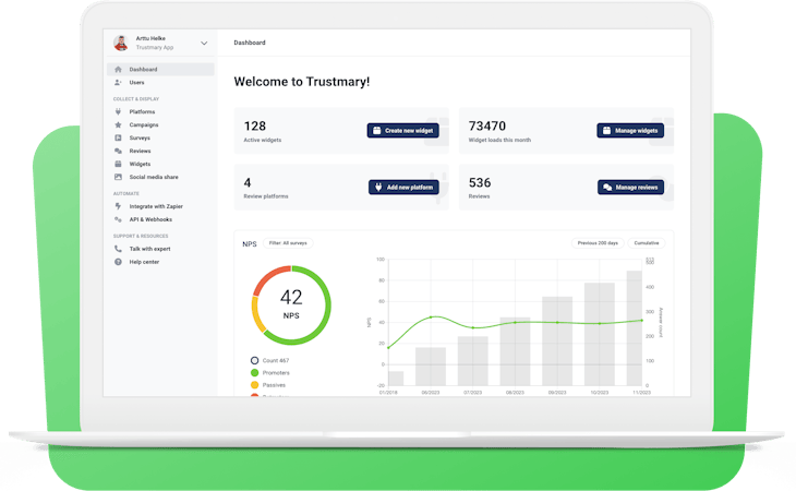 Build more trust on your website with reviews. Trustmary makes collecting, managing, and showcasing reviews simple and accessible for anyone.