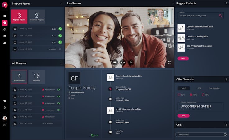 Uptok has a powerful digital workspace to host the shopping sessions. On one robust screen, you can keep an eye on the queue of shoppers, run your sessions, look up products to suggest and generate personal discount codes during a session. In addition, salespeople can proactively reach out to active shoppers and greet them with a non-intrusive video stream right on the product page. No plugins involved. You can suggest products and co-browse with the shopper, help curate the shopping cart one item at a time, and send an unpublished discount code to close the sale.