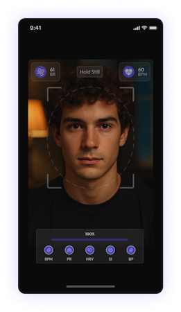 - Measures key vitals (e.g., HR, HRV, breathing rate, BP, SpO₂, stress)
