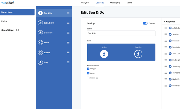 Visit Widget is a platform that empowers destination marketing organizations (DMOs), convention and visitor bureaus (CVBs), parks and recreation departments, and resorts to deliver visitor experiences. The platform's core features include an interactive trip planner, branded mobile apps, an analytics dashboard, and a kiosk system.