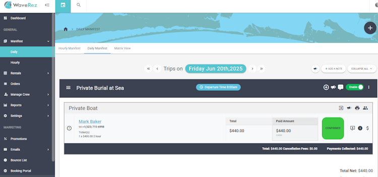 The platform provides an online booking portal that allows customers to book activities. WaveRez's scheduling and calendar management tools enable operators to organize trips and rentals preventing overbooking and scheduling conflicts. Additionally, the software's distribution capabilities allow businesses to expand reach by distributing tours and rentals to resellers, increasing visibility and accessibility.