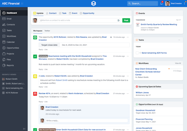 Wealthbox is a leading cloud CRM solution that provides advanced capabilities to help financial advisors and independent financial advisors increase their business and foster collaboration among the firm's team members. Wealthbox integrates with custodial platforms and complementary wealth-tech products and its modern product design offer simplicity in user experience combined with powerful CRM features. Wealth management firms, advisor networks, and broker-dealers use Wealthbox CRM to help them serve clients, streamline operations and grow their businesses.