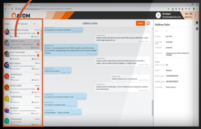 Atom allows Enterprises to view past messages, share files, and provide personalized assistance to customers. It also supports integration with Facebook, Twitter, and other messaging channels, enabling users to gain visibility into client communication, customer assistance, and sales processes.