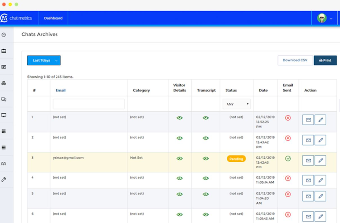 Chat Metrics is a live chat software designed to help businesses communicate with website visitors in real-time and improve overall lead conversion rates. Organizations can maintain a history of chats, view transcripts based on metrics such as category, status, or action, and download them in CSV format according to requirements.