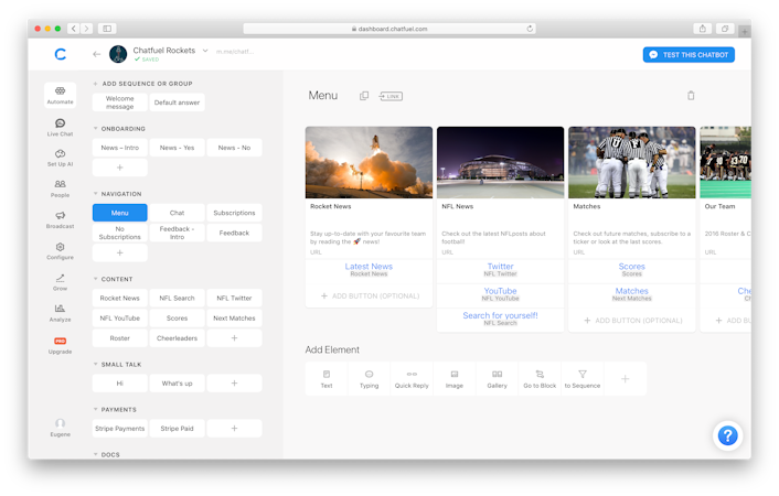 Chatfuel intends to equip users with the tools to create a flexible chatbot capable of accommodating any user needs. Therefore, depending on user requirements, individuals can build a chatbot to serve as an event assistant, personal avatar or customer service advisor. Moreover, using Chatfuel’s analytics technology, users can gain valuable and actionable insight into the performance of their AI bot.