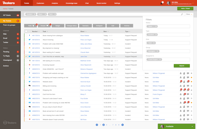 Deskero helps users manage multi-channel support, organizing queries coming from a variety of sources, including email, chat and social networks. A single functional platform will let users take care of all the queries, helping to save time. And it's not just about replying fast to questions, it's about proactively engaging people.