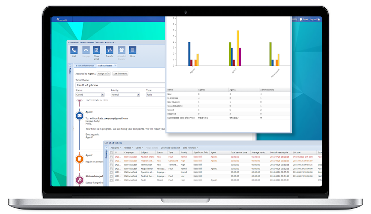 Focus Desk is a cloud-based issue ticketing and service desk solution from Focus Telecom which allows users to manage customer issues through a range of communication channels. Contact through web forms, chat, SMS, email, and phone is supported, and users can switch channels at any time while maintaining consistent communication with the client.